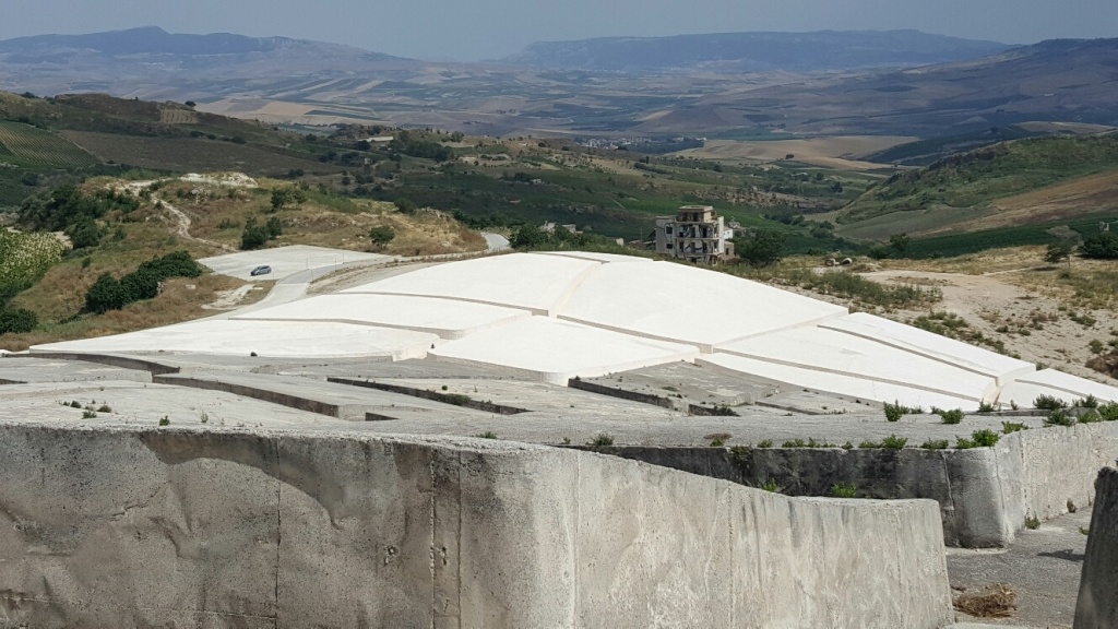 Le « Cretto di Burri » est en effet plus qu’un geste purement artistique. L’artiste Alberto Burri à créé entre 1985 et 1989 un mémorial en hommage aux victimes d’un séisme survenu en 1968., qui a totalement détruit, entre autres, le village de Gibellina, que les survivants ont abandonné. Son œuvre, Il Grande Cretto (le grand craquellement), est conçue comme « une œuvre d’art à la mémoire du tremblement de terre et au silence imposé par la mort dans la vallée. » Un exemple monumental de land art, réalisé à partir de blocs de ciment parcourus de ruelles encaissées qui recouvrent et scellent les vestiges du village de Gibellina. L’œuvre s’étale sur le flanc sud sud-est de la montagne selon la forme d’un quadrilatère irrégulier de douze hectares. Dans le ciment ont été tracées de grandes tranchées, de 1 mètre 60 de profondeur et de 2 à 3 mètres de largeur, permettant aux visiteurs de circuler. Elles suivent le tracé des rues de l’ancienne ville, et permettent de restituer l’idée de la cité avant le tremblement de terre.